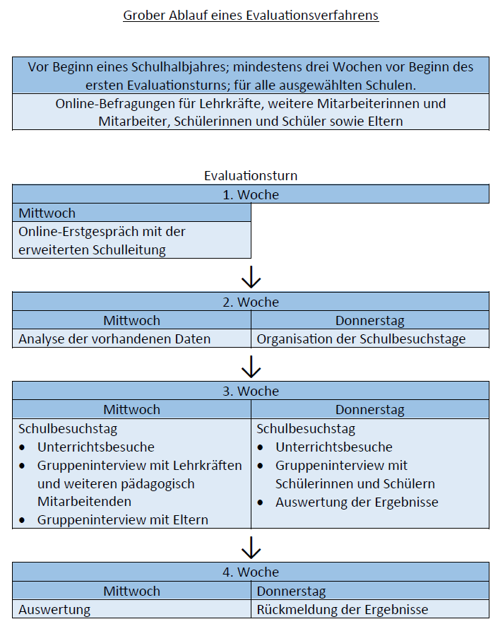 Die Ergebnisse der Online-Befragung, der Dokumentenanalyse sowie die gewonnenen Erkenntnisse des Schulbesuchs und der Interviews werden vom Evaluationsteam in Bezug auf die Evaluationsbereiche und Beobachtungsschwerpunkte ausgewertet. Bei einer Rückmeldungsveranstaltung werden die Ergebnisse der Schulleitung, der Schulaufsicht, dem öPR und gegebenenfalls ausgewählten Vertretern weiterer Personengruppen vorgestellt. Nach der Rückmeldungsveranstaltung wird der Schule die Präsentation, die Befragungsergebnisse sowie eine zusammenfassende Auswertung der Unterrichtsbeobachtungen übergeben.
