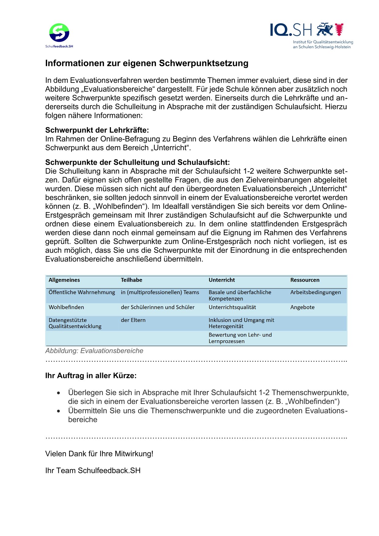 Maximal zwei Beobachtungsschwerpunkte können dem Evaluationsteam seitens der Schulleitung mit auf den Weg gegeben werden. Dabei ist die Schulaufsicht einzubeziehen. Zudem sollten sie von den Zielen abgeleitet werden, die zwischen Schule und Schulaufsicht vereinbart wurden. Ein weiterer Beobachtungsschwerpunkt wird über die Online-Befragung der Lehrkräfte gewonnen. Insgesamt sind somit maximal drei Schwerpunkte möglich.