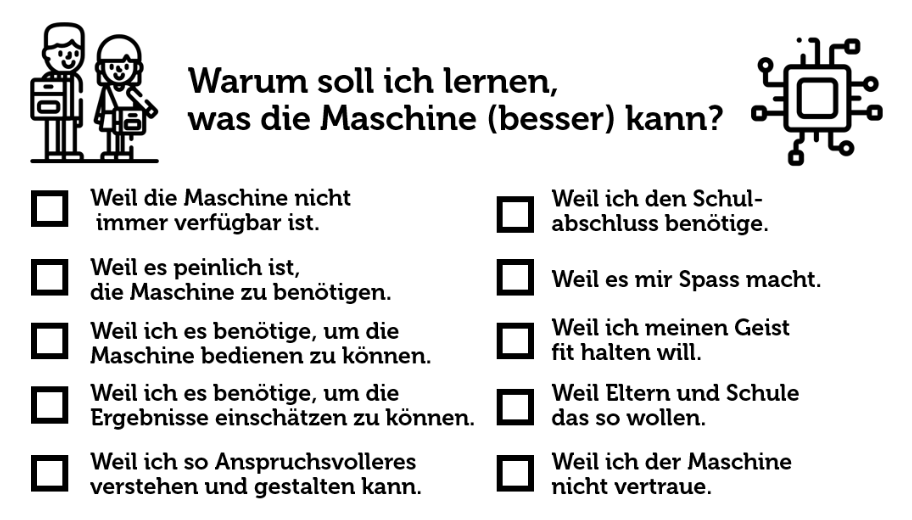 Scheinbar wirft Künstliche Intelligenz uns zurück auf die Frage, was wirklich wichtig ist. Wie animieren wir zum Lernen? Wie wollen wir die Zeit im Unterricht nutzen? Welche Lernkonzepte tragen noch, wenn Lernprodukte jetzt auf Knopfdruck entstehen?