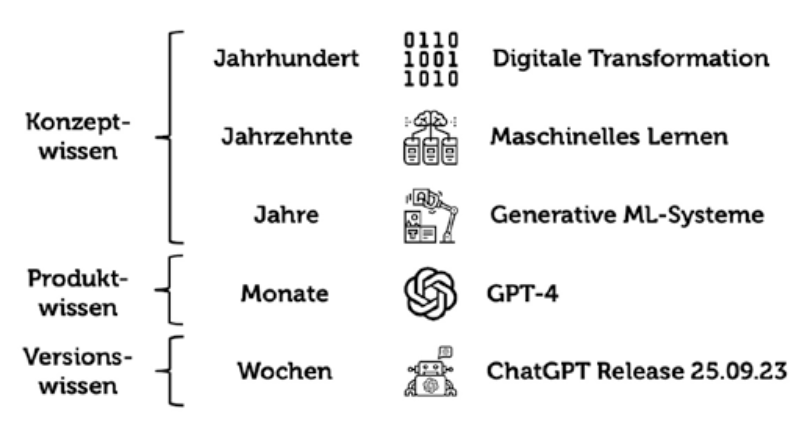 - Stützen Sie sich beim Aufbau Ihrer eigenen AI Literacy auf „Konzeptwissen“ statt auf „Versionswissen“ (s. Abb. 2). Sie brauchen sich nicht sorgen, dass Sie den Anschluss verpassen. Es ist nicht so wichtig, immer die neuesten Tools zu kennen, wenn Sie ein grundlegendes Verständnis der Technologie (z.B. Sprachmodelle) entwickelt haben. Diese bildet die Basis für eine grundlegende Orientierung und Beurteilungskompetenz.