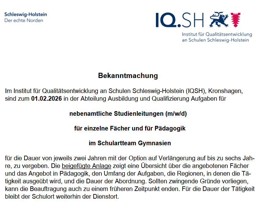 Am IQSH ist zum 01.02.2026 die Stelle einer nebenamtlichen Studienleitung (m/w/d) im Fach Informatik im Schulartteam Gymnasien für die Dauer von zwei Jahren mit der Option auf Verlängerung auf bis zu sechs Jahre zu vergeben.